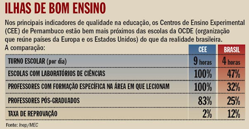 O programa, implantado há quatro anos por iniciativa dos empresários e que agora colhe os resultados, não é o primeiro no país a aplicar esse tipo de cartilha nas escolas — mas, certamente, é o que fez isso de maneira mais radical. Os professores, por exemplo, são avaliados em quatro frentes: recebem notas dos alunos, dos pais e do diretor e ainda outra pelo cumprimento das metas acadêmicas. Aos melhores, é concedido bônus no salário. Diretores à frente de uma escola cujos alunos não avançam nas médias, por sua vez, são removidos do cargo. Já estudantes como Jéssica Simões de Andrade, 17 anos, assinam um contrato na hora da matrícula, por meio do qual se tornam responsáveis pela preservação de laboratórios e salas de aula. Filha de uma empregada doméstica e de um mecânico que não passaram do ensino fundamental, Jéssica acaba de passar no vestibular de quatro universidades. Optou pelo curso de química industrial da Federal de Pernambuco: "Cheguei a achar que não dava para os estudos". Ela e outros 77% dos jovens desses Centros de Ensino Experimental (CEE), como as escolas são conhecidas, vêm de famílias cuja renda não passa de dois salários mínimos por mês. Até então, eram apenas maus alunos, com pouco ou nenhum interesse pela sala de aula. O que os fez, afinal, entusiasmar-se tanto pelos estudos? Um grupo de professores de bom nível, não há dúvida, foi um fator determinante. Em meio a milhares de concursados no estado, esses foram escolhidos a dedo, tal como os diretores. Todos passaram por uma prova de conhecimentos específicos, são formados nas áreas em que lecionam e 83% têm uma especialização ou mesmo um mestrado — raridade no cenário das escolas públicas do país. Por contrato, eles ainda prometem dedicação exclusiva à escola, o que lhes garante tempo para atender pais e alunos e preparar as aulas. Essa é também uma prática básica, mas incomum no Brasil. Cada aula segue um roteiro bem amarrado. O professor Djair da Silva, há quinze anos na rede pública e há quatro no CEE, traduz o clima de seus colegas de lá: "Voltar para a escola pública tradicional, nem pensar". Djair e os outros professores não só têm credenciais mínimas para ensinar suas respectivas