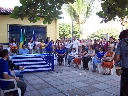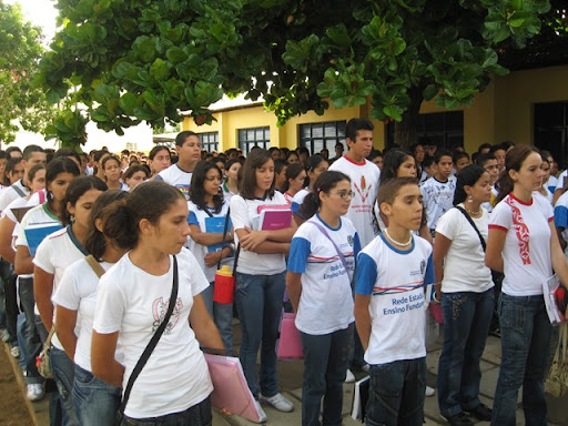 Alunos organizam-se no pátio do Centro de Referência Joaquim Mendes e cantam o Hino Nacional antes de iniciares as atividades do dia letivo.