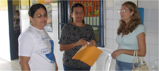 A Gestora da GRE do Alto Pajeú, Cecília Patriota (ao centro) visita o Centro de Referência Joaquim Mendes e confere as atividades juntamente com a Gestora do Centro, Albacleide (esquerda) e a Coordenadora de Biblioteca, Marluce (direita).